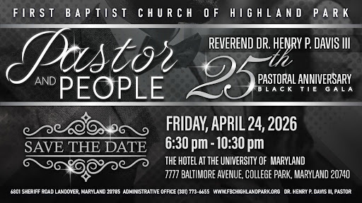 A milestone moment is on the horizon! We are celebrating a legacy as we honor Reverend Dr. Henry P. Davis III for 25 years of faithful pastoral leadership at First Baptist Church of Highland Park. Pastor and People Black Tie Gala Friday, April 24th, 2026 from 5:30 – 10:30 PM at The Hotel at the University of Maryland. Reserve your seat by purchasing individual tickets for $175.00 or consider becoming a Gold, Silver or Bronze sponsor. Partial payments are accepted, $100 down – $75 balance due by March 23rd. For additional details contact Trustee Chairman Randolph Williams, Jr. at the Administrative Office (301) 773-6655.